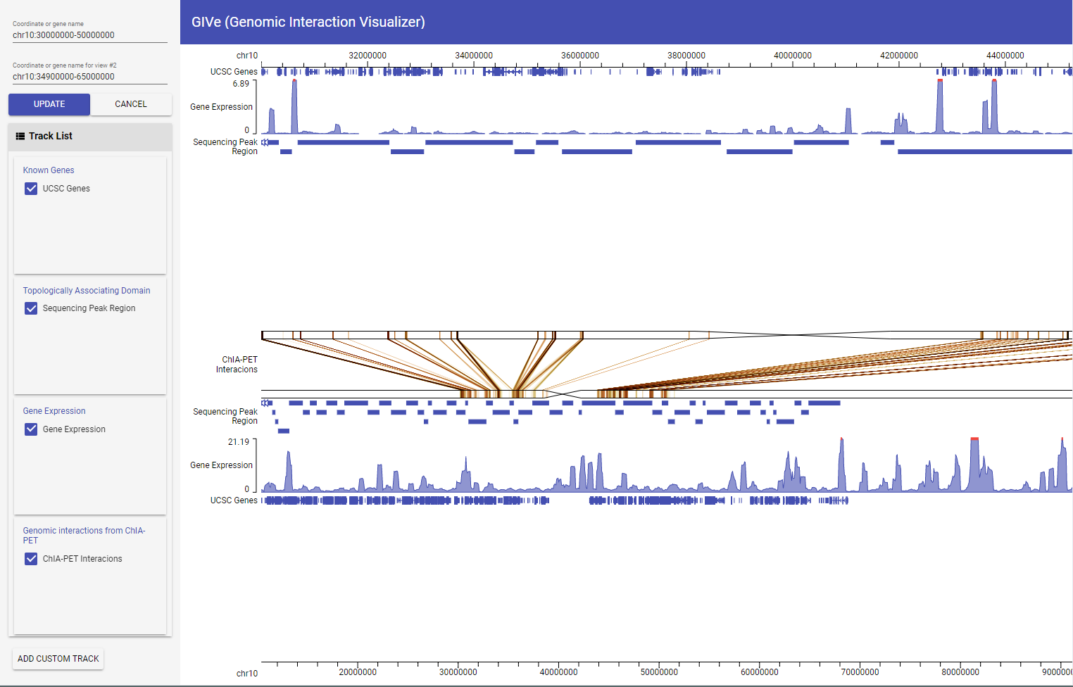GIVE support gene annotation, bed, bigWig and interaction data tracks. Here are some documents regarding the format definitions and related visualizing options in GIVE: